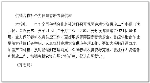 中華全國(guó)供銷合作總社近日召開(kāi)保障春耕農(nóng)資供應(yīng)工作電視電話會(huì)議。會(huì)議要求,要學(xué)習(xí)運(yùn)用“千萬(wàn)工程”經(jīng)驗(yàn),充分發(fā)揮供銷合作社優(yōu)勢(shì)作用、全力做好春耕農(nóng)資供應(yīng)工作、更好服務(wù)保障國(guó)家糧食安全。各級(jí)供銷合作社要落實(shí)落細(xì)任務(wù)舉措,認(rèn)真抓好春耕農(nóng)資供應(yīng)各項(xiàng)工作。要加大采購(gòu)調(diào)運(yùn)力度,加強(qiáng)產(chǎn)銷對(duì)接,及時(shí)配送到基層網(wǎng)點(diǎn),保障春耕農(nóng)資貨源充足。要抓好農(nóng)資儲(chǔ)備和投放工作,加強(qiáng)春耕農(nóng)資市場(chǎng)分析研判,促進(jìn)市場(chǎng)穩(wěn)定。