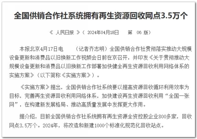 【人民日?qǐng)?bào)】全國(guó)供銷合作社系統(tǒng)擁有再生資源回收網(wǎng)點(diǎn)3.5萬個(gè)